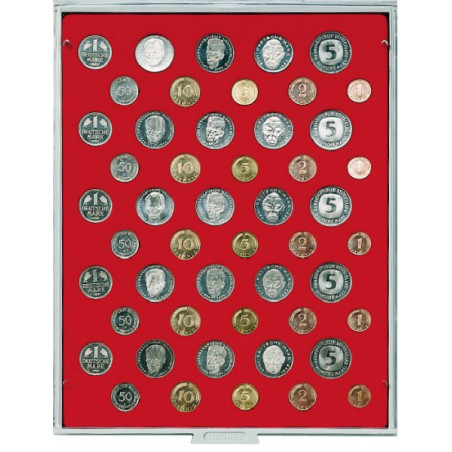 Plateaux velours pour monnaies - MADE IN GERMANY !Les plateaux velours de haute qualité, contenus dans nos box monnaies très réputés, sont également disponibles séparément et offrent ainsi la possibilité de remplacer un plateau d€˜un box monnaies ou de l€™intégrer dans un propre système de rangement.Toutes les variantes de plateaux velours sont disponibles au choix en rouge vif et rouge foncé.Les variantes les plus courantes sont également disponibles en bleu foncé ou noir.