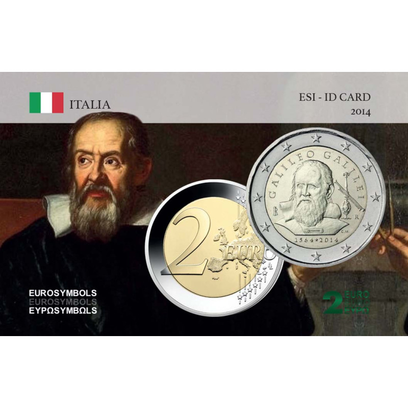 La 2€ Italie 2014 commémore le 450ème anniversaire de la naissance de Galileo Galilée, mathématicien, géomètre, physicien et astronome du XVIIème siècle.