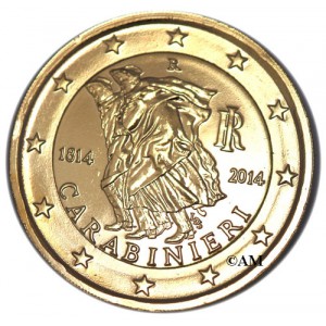 Emise par l'Italie, cette pièce de 2 euro commémorative millésimée 2014, célèbre le 200ème anniversaire de la fondation "Arma dei Carabinieri" et vous est proposée dorée à l'or fin 24 carats.