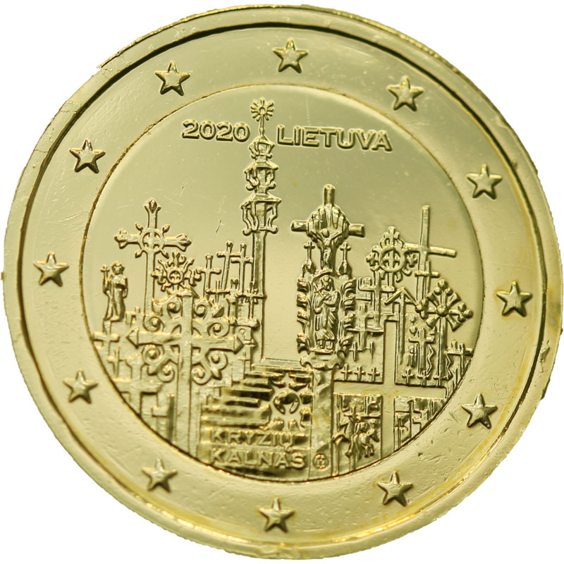 La face nationale de la pièce représente la colline des croix: fragments de croix en bois et forgées, symbolisant l'artisanat et la culture folklorique lituaniens. L'artisanat et le symbolisme croisés en Lituanie sont inscrits sur la Liste représentative de l'UNESCO du patrimoine culturel immatériel de l'humanité. La pièce comporte les inscriptions LIETUVA (LITUANIE) et KRYŽIŲ KALNAS (LA COLLINE DES CROIX), l'année d'émission (2020) et le cachet de la monnaie lituanienne. L'anneau extérieur de la pièce porte les 12 étoiles du drapeau de l'Union européenne.