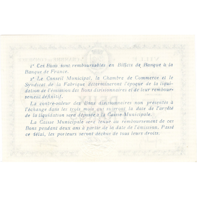 La banque de France autorisa les chambres de commerce de chaque région à émettre des billets à condition que les chambres de commerce garantissent par des fonds de contre valeurs à la banque de France leurs émissions.