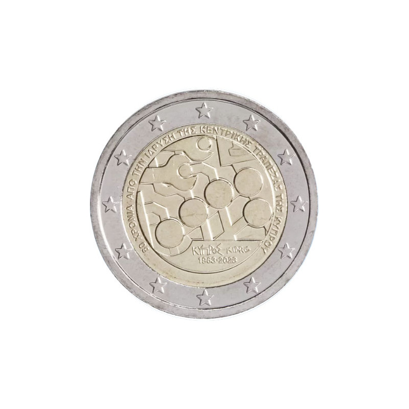 Sur le cœur, un dessin commémorant les soixante ans de la Banque Centrale de Chypre, illustrant de manière symbolique la stabilité de l’économie grâce à cette dernière, dans l’ère industrielle et digitale actuelle, avec des outils mettant au point une puce électronique ; dans la partie basse, le nom du pays émetteur en grec ΚΥΠΡΟΣ et en turc KIBRIS (CHYPRE), l’année de fondation de l’établissement bancaire, 1963, et le millésime, 2023 ; longeant la couronne, la légende “60 ΧΡOΝΙΑ ΑΠO ΤΗΝ IΔΡΥΣΗ ΤΗΣ ΚΕΝΤΡΙKHΣ ΤΡAΠΕΖΑΣ ΤΗΣ ΚYΠΡΟΥ” (en français “60 ANS DEPUIS L’ETABLISSEMENT DE LA BANQUE CENTRALE DE CHYPRE”) ; sur la couronne, les douze emblématiques étoiles européennes à cinq branches pointe vers le haut