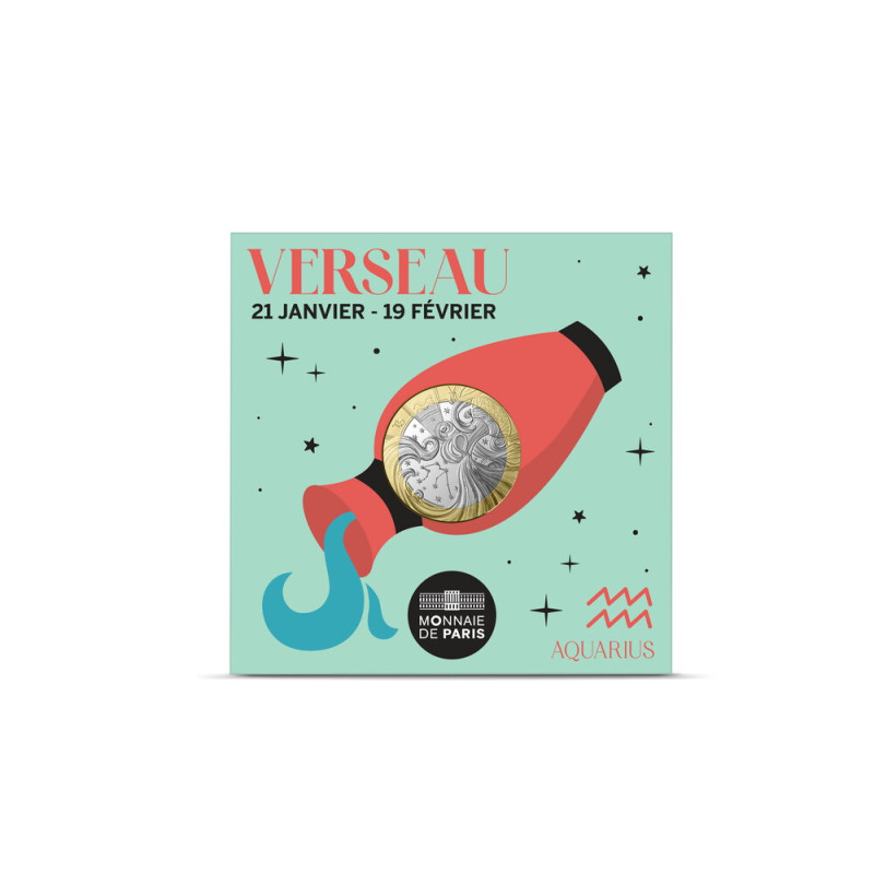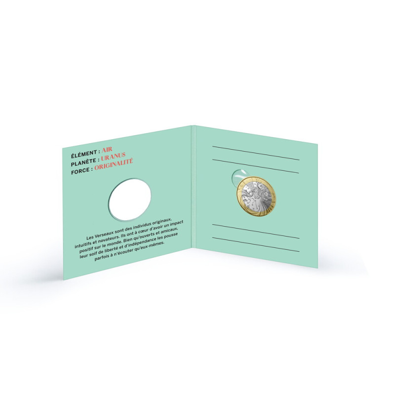 La roue des signes du zodiaque est gravée sur la couronne de couleur dorée de la monnaie. Un signe se détache particulièrement du fond par sa taille supérieure aux autres et un fond sablé, différent de celui plus lisse des autres. C’est le symbole du Verseau. Une partie de la roue est cachée par des spirales de brume en référence à l’air, élément de ce signe. Une autre partie de la roue est submergée par de l’eau que verse le bec d’un vase orné. En arrière-plan, on reconnaît un ciel étoilé dans lequel est tracée la constellation du Verseau.