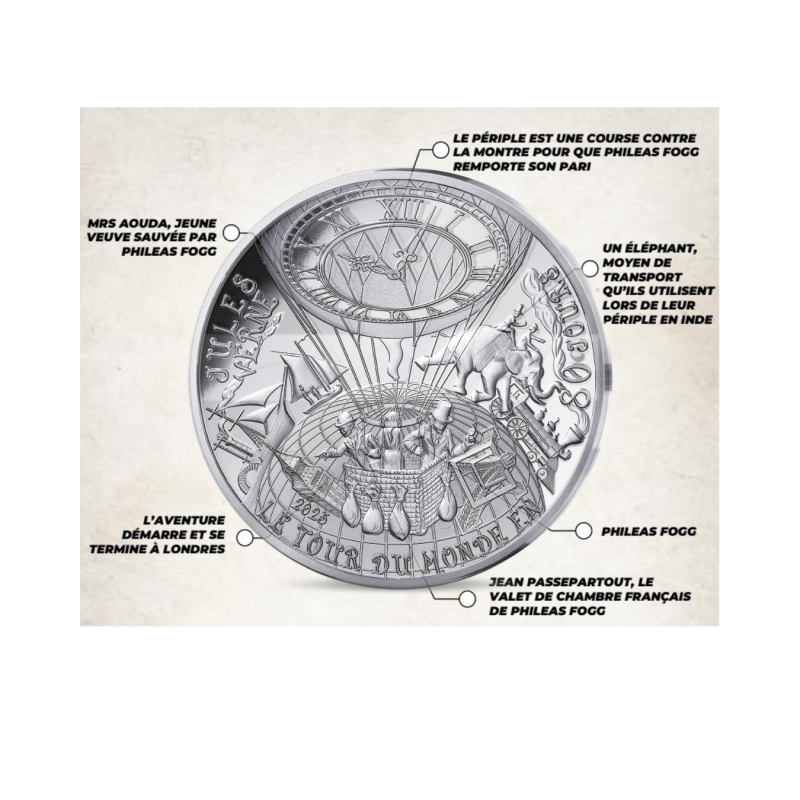 Sur la face de cette pièce, Phileas Fogg est au premier plan dans sa montgolfière, accompagné de Jean Passepartout, son fidèle valet français, et de Mrs Aouda, la jeune veuve qu’il a sauvée.