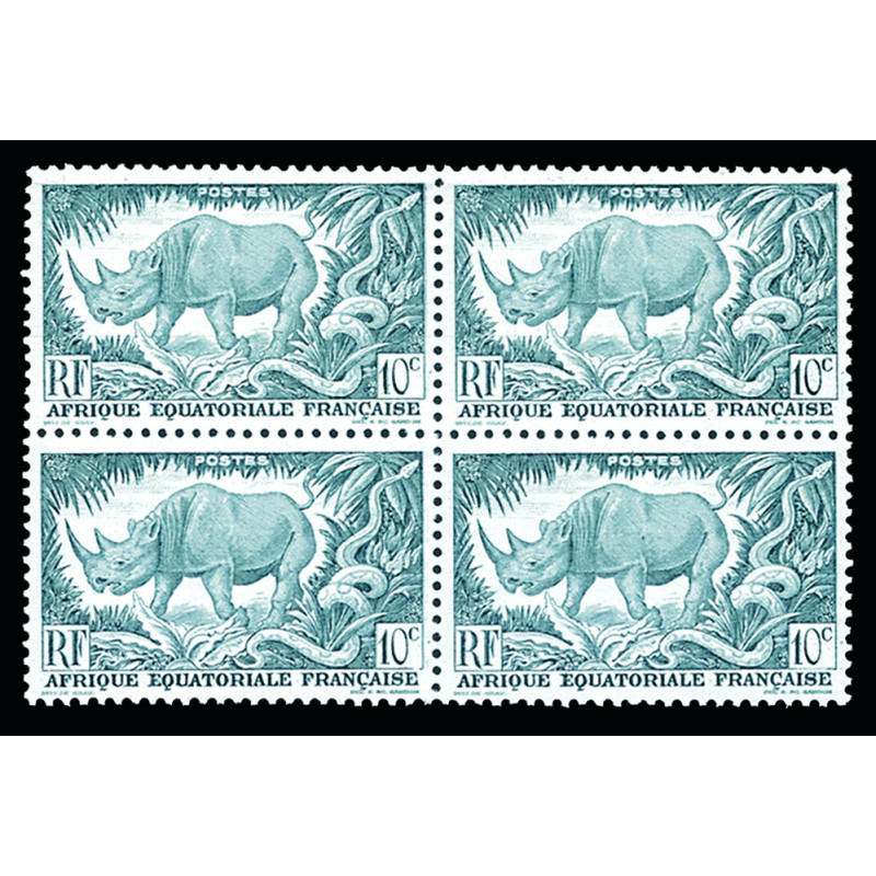 AEF Rhinocéros bloc de 4 timbres - 1947 variété bleu vert