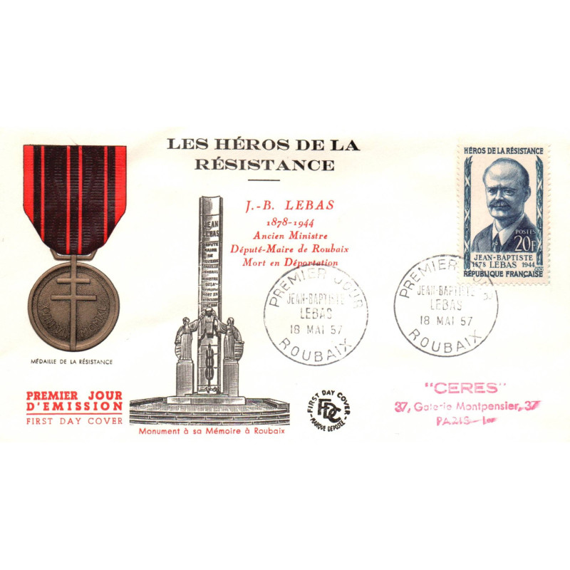 Enveloppe 1er jour1957- Héros de la résistance- JB Lebas