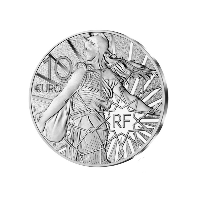 Au revers, on retrouve une adaptation modernisée de la semeuse du graveur Louis-Oscar Roty, laissant apparaitre sur le drapé de sa robe une version héraldique du drapeau français. La mention « RF » est également encerclée d’un enlacement d’hexagones rappelant la France.