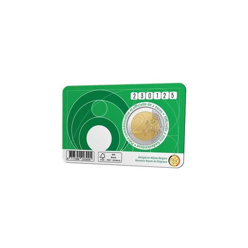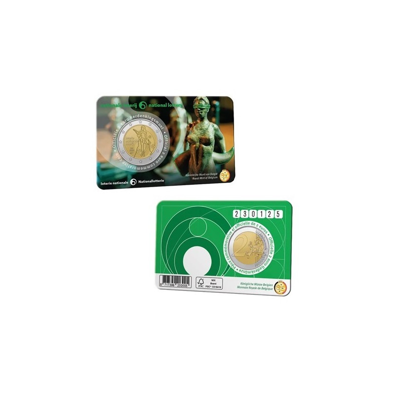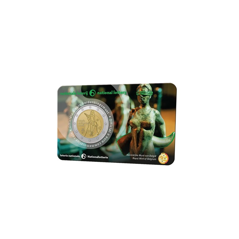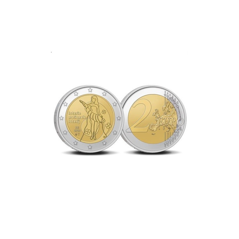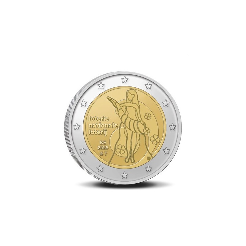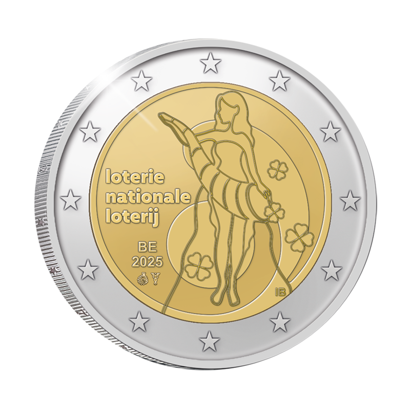 La pièce arbore le logo de la Loterie surmonté de la déesse Fortuna avec la corne d'abondance, d'où tombent plusieurs trèfles à quatre feuilles. L'émission de cette pièce commémorative par la Monnaie royale de Belgique a l'objectif de mettre à l'honneur "le rôle social" de la Loterie nationale.