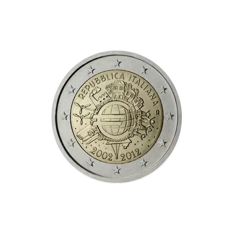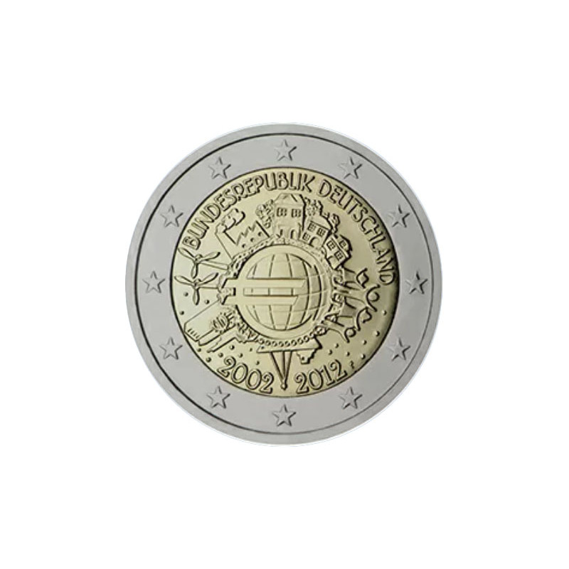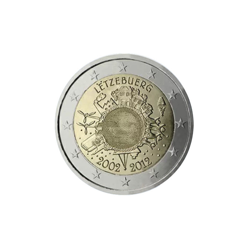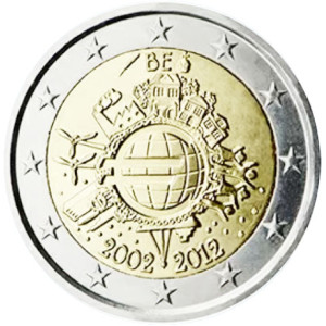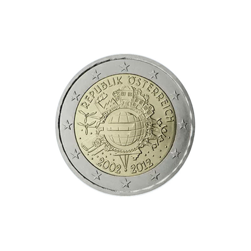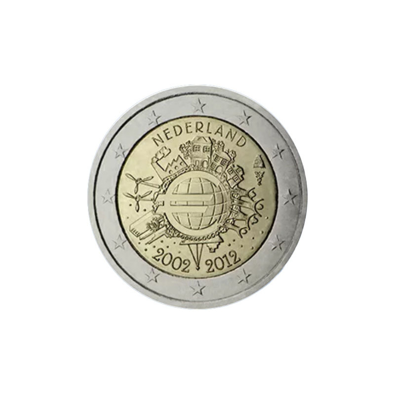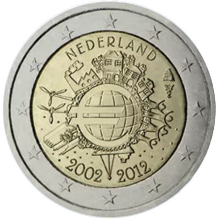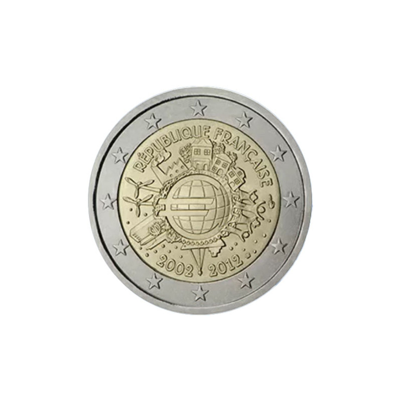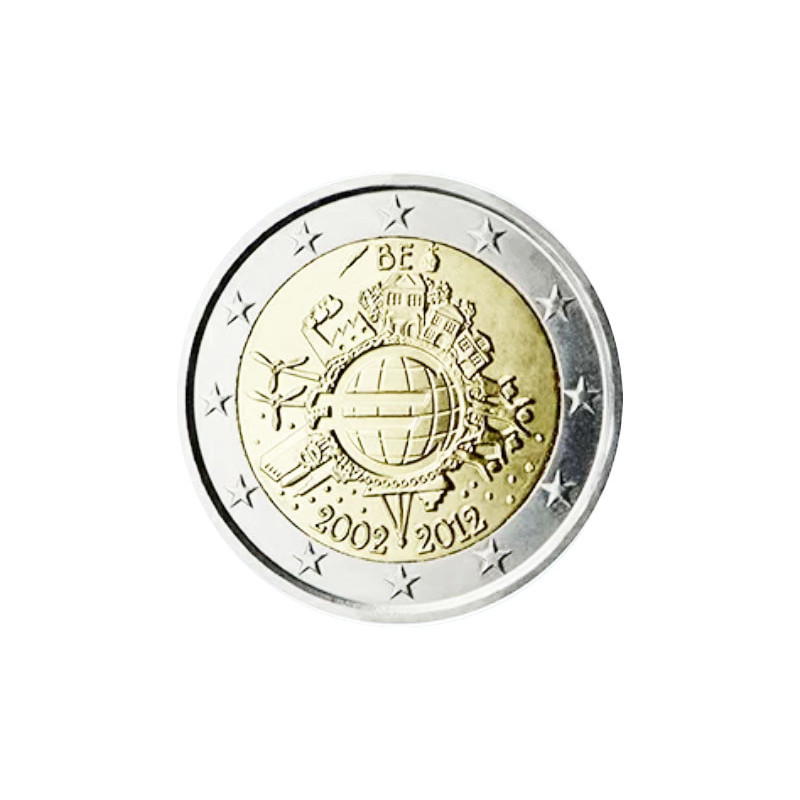 Ces pièces de 2€ commémoratives communes émises en 2012 par les pays de la zone euro commémorent les 10 ans de la monnaie €uro.