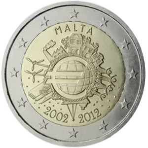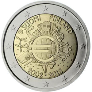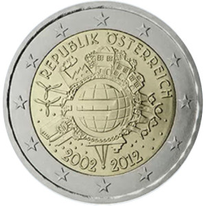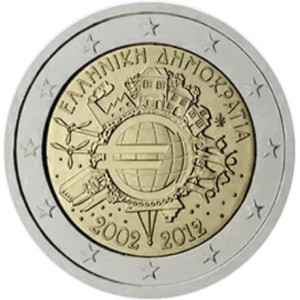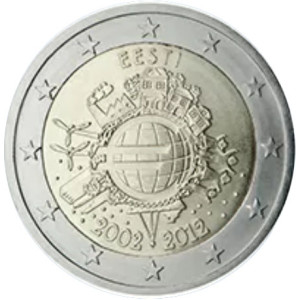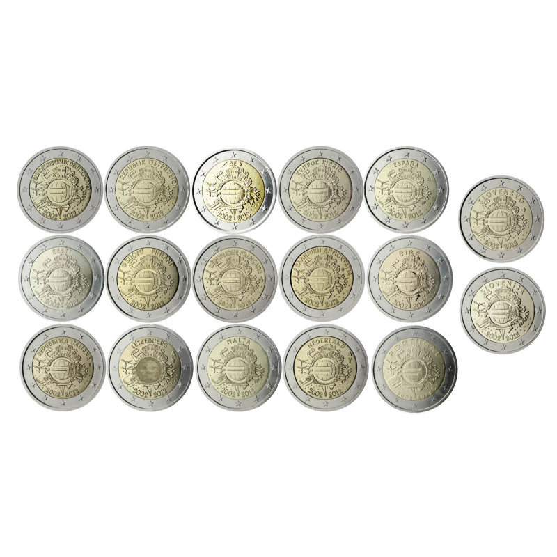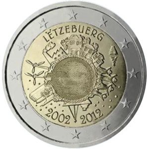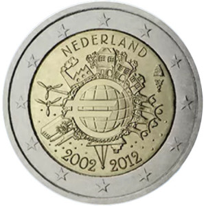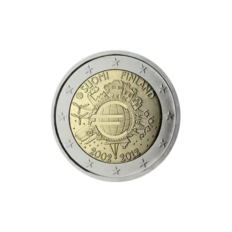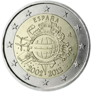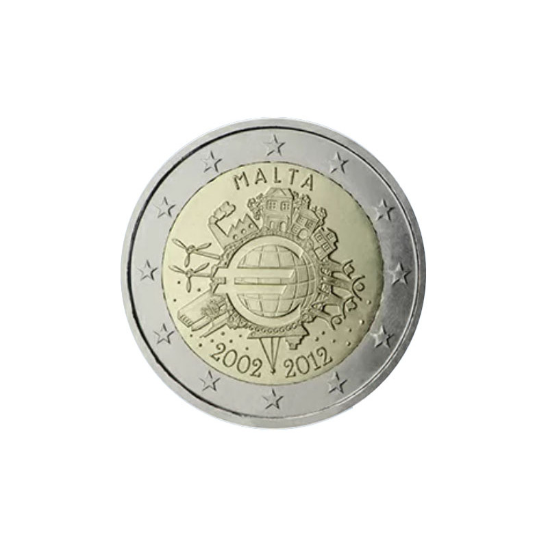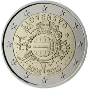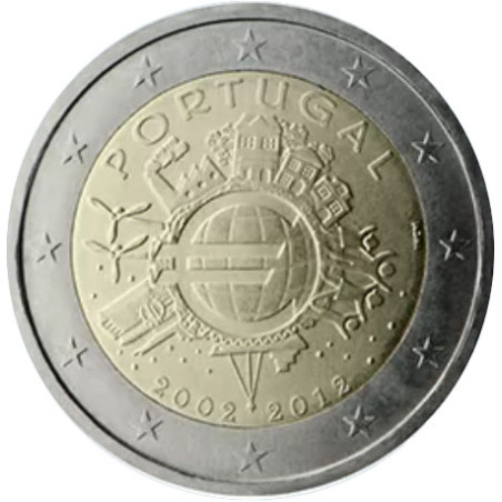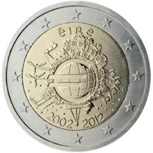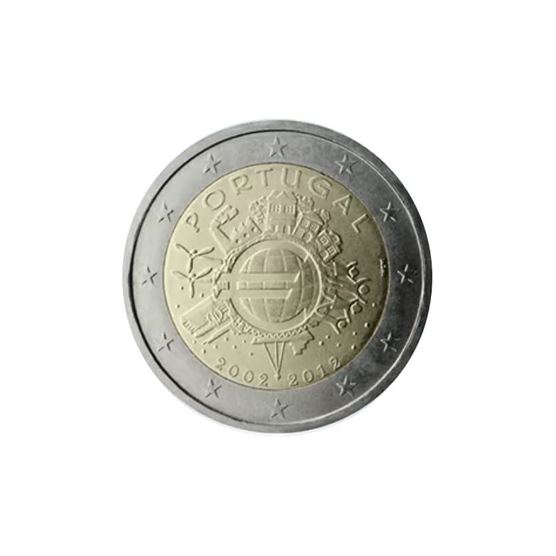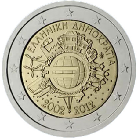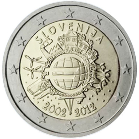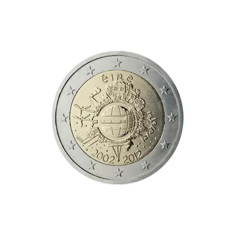 Ces pièces de 2€ commémoratives communes émises en 2012 par les pays de la zone euro commémorent les 10 ans de la monnaie €uro.