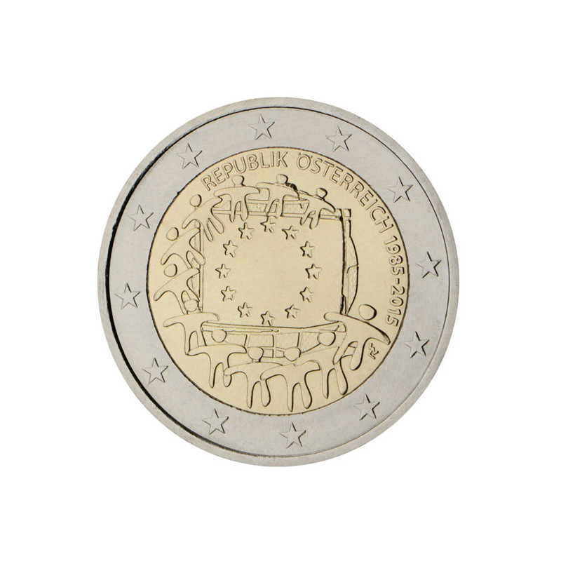 Pièce de 2 euro commémorative autrichienne émise en commun avec tous les pays de l'euro à l'occasion du 30ème anniversaire du drapeau européen, millésimée 2015.