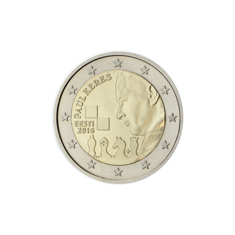 Cette pièce de 2€uro commémorative Estonie 2016 commémore 100e anniversaire de la naissance de Paul Keres, célèbre grand-maître estonien du jeu d’échecs.