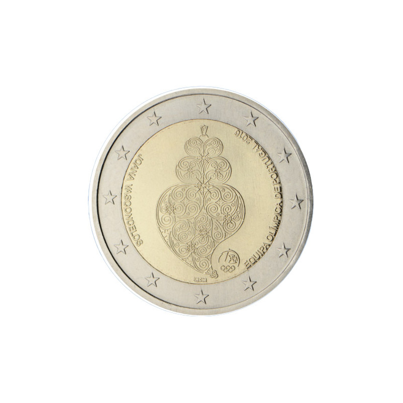 L'avers représente une image reprenant la célèbre œuvre d’art signée par son auteur, Joana Vasconcelos, le « cœur de Viana », inspirée de la bijouterie traditionnelle du nord du Portugal (région où se trouve la ville de Viana do Castelo). Il symbolise le soutien du peuple portugais à l’équipe nationale à l’occasion des Jeux olympiques. Les inscriptions « JOANA VASCONCELOS » et « EQUIPA OLÍMPICA DE PORTUGAL 2016 » apparaissent en demi-cercle, à gauche et à droite respectivement. En bas figure la marque d’atelier, « INCM ». Les douze étoiles de l’Union européenne sont représentées dans l’anneau extérieur de la pièce.