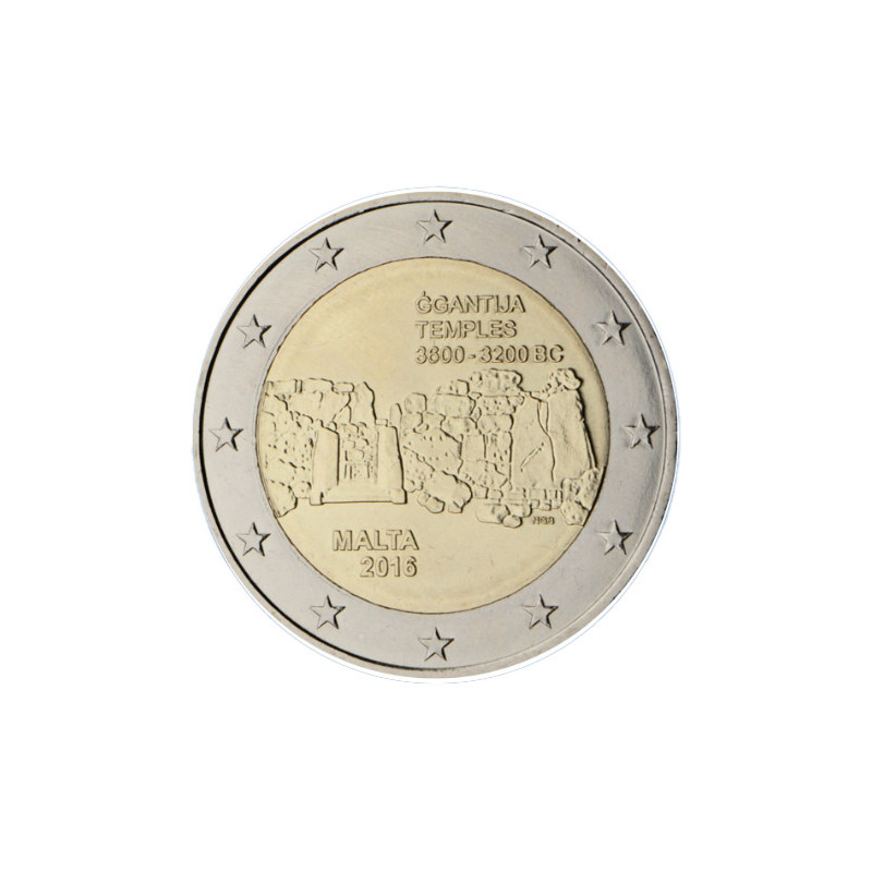 L'avers représente les temples de Ġgantija, situés sur l’île de Gozo. Ġgantija est le nom du site abritant ces temples mégalithiques datant du Néolithique. Il s’agit de l’une des plus anciennes constructions autoportantes du monde, mais aussi de l’une des plus anciennes structures religieuses. Construits vers le 36e siècle avant Jésus-Christ, les temples de Ġgantija sont antérieurs au site de Stonehenge et aux pyramides égyptiennes. L’inscription « ĠGANTIJA TEMPLES » apparaît dans la partie supérieure droite de la pièce, suivie des années « 3600-3200 BC ». Dans la partie inférieure gauche figure le nom du pays émetteur, « MALTA », et en dessous, l’année d’émission, « 2016 », encadrés par la marque du maître et la marque d’atelier.