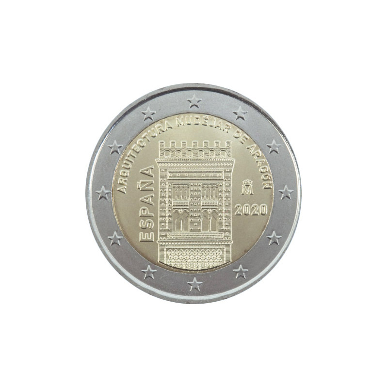 le dessin représente la tour d’El Salvador de Teruel. À gauche, en majuscules, figure l’inscription « ESPAÑA » et, à droite, se trouvent la marque d’atelier et, sous celle-ci, la date d’émission, 2020. En haut et au centre, en arc de cercle et en majuscules, est gravée la légende « ARQUITECTURA MUDEJAR DE ARAGÓN ». Les douze étoiles de l’Union européenne sont représentées dans l’anneau extérieur de la pièce.