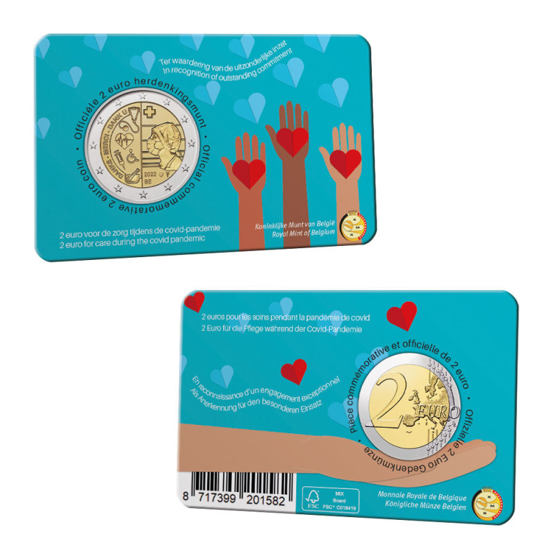 La Monnaie Royale de Belgique émettra une pièce unique de 2 euros, en reconnaissance des efforts exceptionnels des travailleurs de la santé pendant la pandémie de covid. La version BU en coincard est un véritable honneur pour tous les travailleurs de la santé. Ceci est illustré sur l'emballage par un affichage graphique de mains et de cœurs attentionnés. Sur le côté gauche de la pièce elle-même, vous pouvez lire le texte « DANKE – MERCI – DANK U ». Des éléments de soins de santé sont également présentés, comme un stéthoscope, un moniteur cardiaque, une seringue, le symbole d'un fauteuil roulant et un mortier avec un pilon. Sur la droite, il y a un membre du personnel soignant photographié avec un masque facial et à côté de cela deux lettres LL (les initiales du designer Luc Luycx). En bas, vous pouvez voir la date de l'année 2022, la désignation du pays BE, la marque privée (les armoiries d'Herzele) et la marque d'atelier de la Royal Dutch Mint