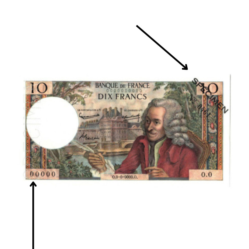 Attention : Un billet spécimen ne compte pas forcément les trois caractéristiques, mais souvent deux sur les trois.