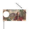 Recto : portrait de Voltaire, écrivain Français, coiffé d’une perruque écrivant à la plume d’oie. En fond le Palais des Tuileries.