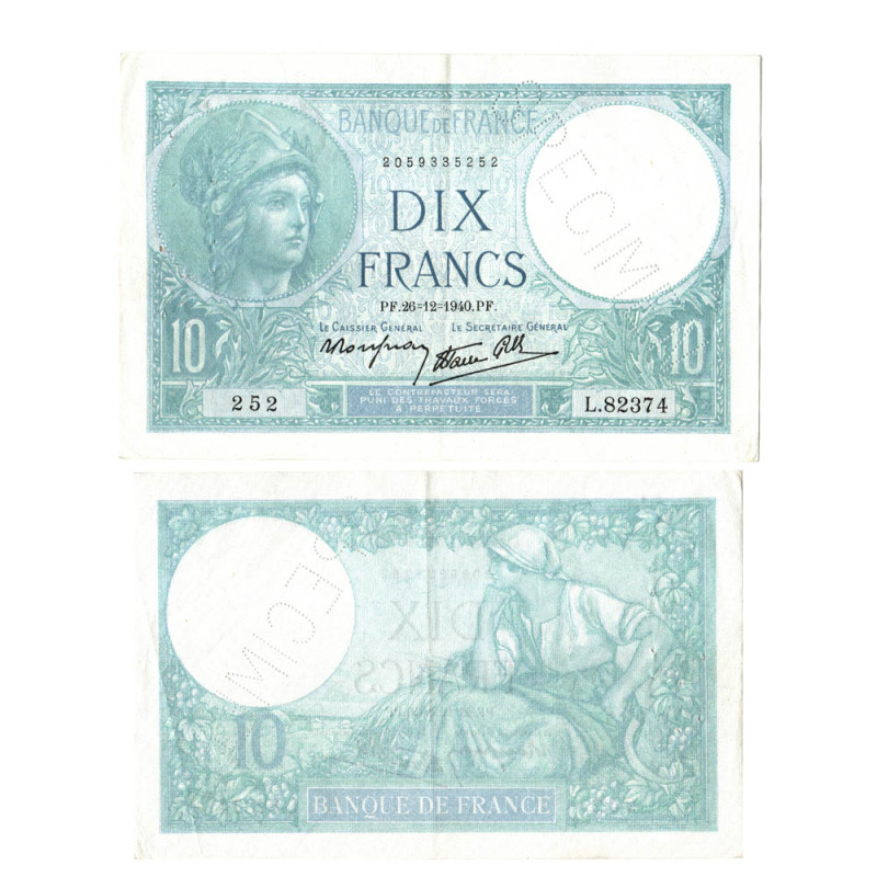 Billet Authentique 10 Francs Minerve et Paysanne Caissier General 1939/1942 - Perforé Spécimen