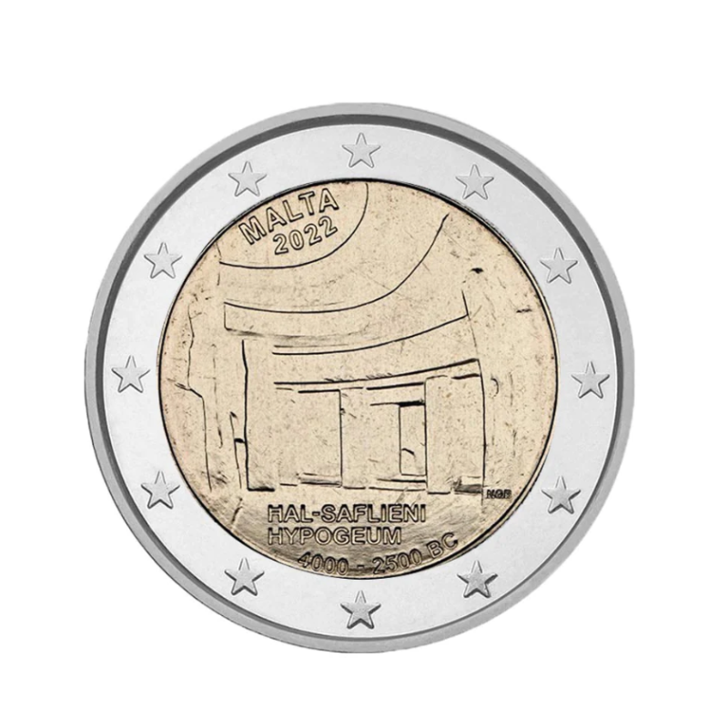 Au centre de la pièce la représentation de l’hypogée de Ħal Saflieni, le nom du pays émetteur MALTA (en français “MALTE”), le millésime 2022 et les initiales NGB du graveur Noel Galea Bason ; sur la couronne, les douze emblématiques étoiles européennes à cinq branches pointe vers le haut.
