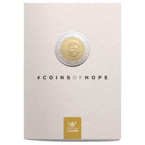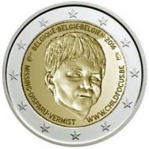 La pièce représente le visage d'un enfant accompagné du nom de l'association belge CHILD FOCUS. Cette association aide les familles d'enfants disparus.