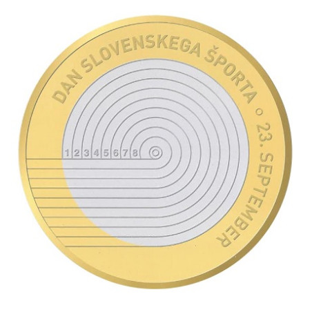 Le revers de la pièce arbore un motif dédié à la Journée du sport slovène, qui se tient le 23 septembre. Il est accompagné de l'inscription "DAN SLOVENSKEGA ŠPORTA º 23. SEPTEMBER", soulignant ainsi la date de cette célébration nationale.