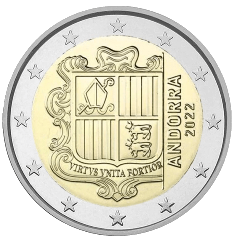Descriptif de la pièce : La pièce de 2 euros montre les armoiries d'Andorre avec la devise « virtus unita fortior » (la vertu unie est plus forte »).