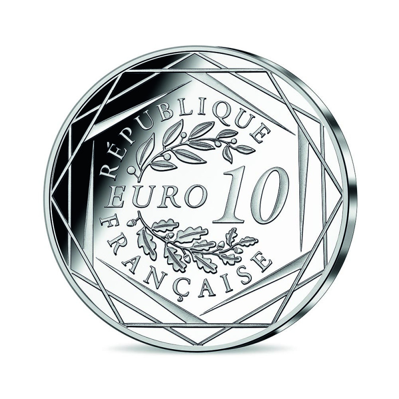 La face de la monnaie représente un joueur de rugby en pleine action qui court avec un ballon. Derrière lui se dresse un monument français emblématique et symbole de victoire : l’Arc de Triomphe. Sous l’arche on peut distinguer des poteaux, comme si l’Arc était au milieu d’un stade. Dans le ciel, une planète ovale fait référence à la « planète rugby ».