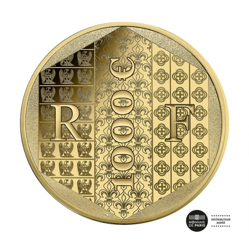 FACE : Réinterprétation du franc napoléonien gravé par Jean-Jacques BARRE, cette monnaie présente sur sa face un portrait laurée de l’empereur napoléon III. Son profil fut fortement inspiré par celui de son oncle Napoléon 1er, ayant lui-même construit son image en s’inspirant de l’empereur romain Jules César. À droite de son profil, on retrouve les armoiries napoléoniennes initialement présentes au revers des monnaies impériales. Premier volet de la série « Ors de France », cette monnaie est un cadeau idéal pour les passionnés comme les amateurs d’histoire.