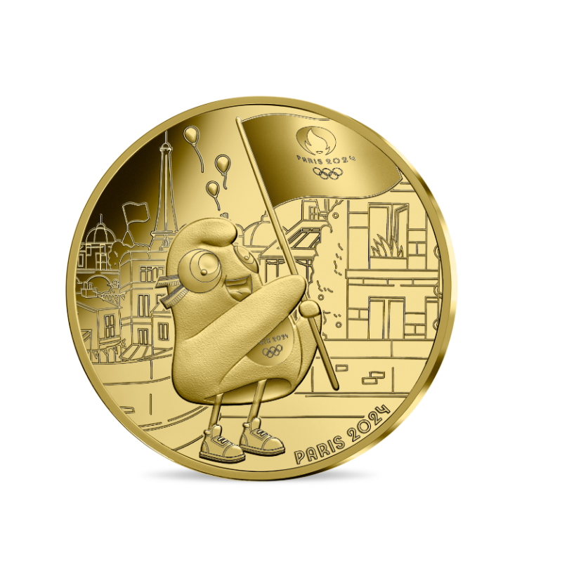 Au cœur de Paris, la Mascotte des Jeux Olympiques de Paris 2024 brandit le drapeau avec l’emblème des Jeux pour affirmer sa joie de pouvoir assister à une telle compétition en plein cœur de la capitale française.