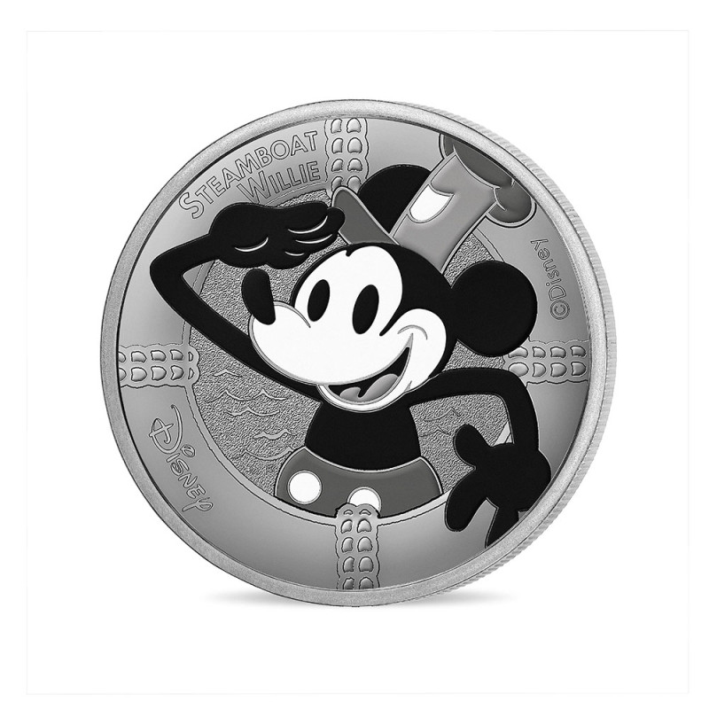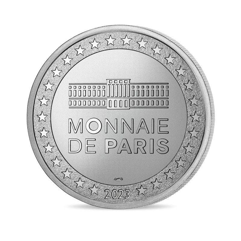 Mickey Mouse, star des studios Disney, fut dessiné en 1928 par Walt Disney et Ub Iwerks en remplacement du personnage d’Oswald le lapin chanceux, Inspiré à la fois par une souris domestique que Walt Disney avait adoptée dans sa jeunesse et par les personnages de dessins animés de l'époque, Mickey a fait sa première apparition la même année dans le court-métrage "Steamboat Willie" ou il incarne un matelot sur un bateau à vapeur. Depuis cette première apparition historique, Mickey Mouse est devenu l'icône emblématique de Disney, propulsant les studios vers un succès international. Le revers est commun aux mini-médailles de la Monnaie de Paris et présente une vue de l’hôtel de la monnaie entouré d’étoiles. Le millésime 2023 est également présent au-dessus du listel.