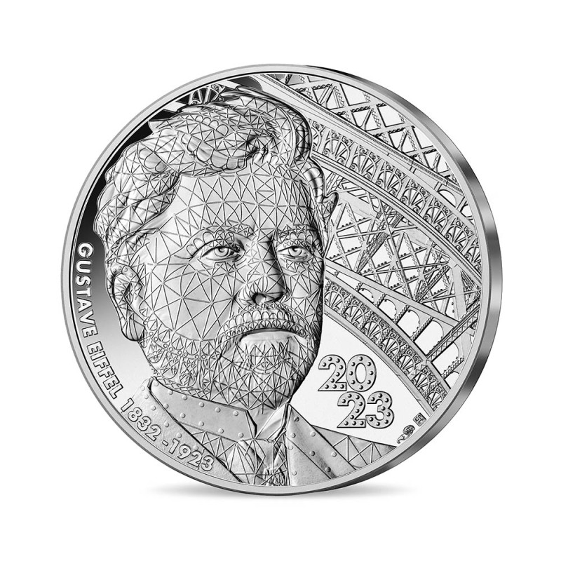 Sur la face de la monnaie figure le portrait de Gustave Eiffel devant un arc de la tour qui porte son nom. Le portrait a été travaillé afin que les traits du visage, les cheveux et les vêtements de celui-ci soient faits de rivets, comme si Gustave Eiffel faisait corps avec les structures métalliques qu’il a imaginées tout au long de sa vie. Le millésime 2023 est inscrit sous forme de plaques de métal cloutées près du portrait.