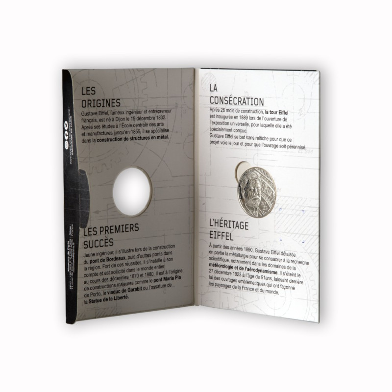 En 2023, à l’occasion du centenaire de la disparition de Gustave Eiffel, la Monnaie de Paris rend hommage à celui-ci à travers une collection de monnaies mettant en avant l’homme et son Œuvre. Fameux ingénieur et entrepreneur français spécialisé dans la construction de structures métalliques, Gustave Eiffel a laissé derrière lui des ouvrages emblématiques ayant façonné les paysages de la France et du monde. La Monnaie de Paris est fière de commémorer ce grand Homme grâce à une collection qui le lie pour la postérité à son matériau de prédilection.