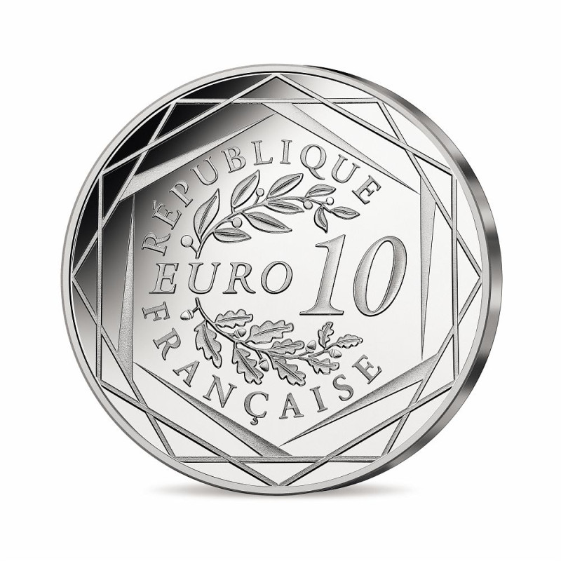 - Le revers des monnaies de 10€ et 100€ expose la valeur faciale entourée de deux branches, l’une de chêne, l’autre de laurier, qui évoquent le sigle de l’Euro. L’ensemble du motif du revers est encadré par un assemblage de traits représentant l’Hexagone.