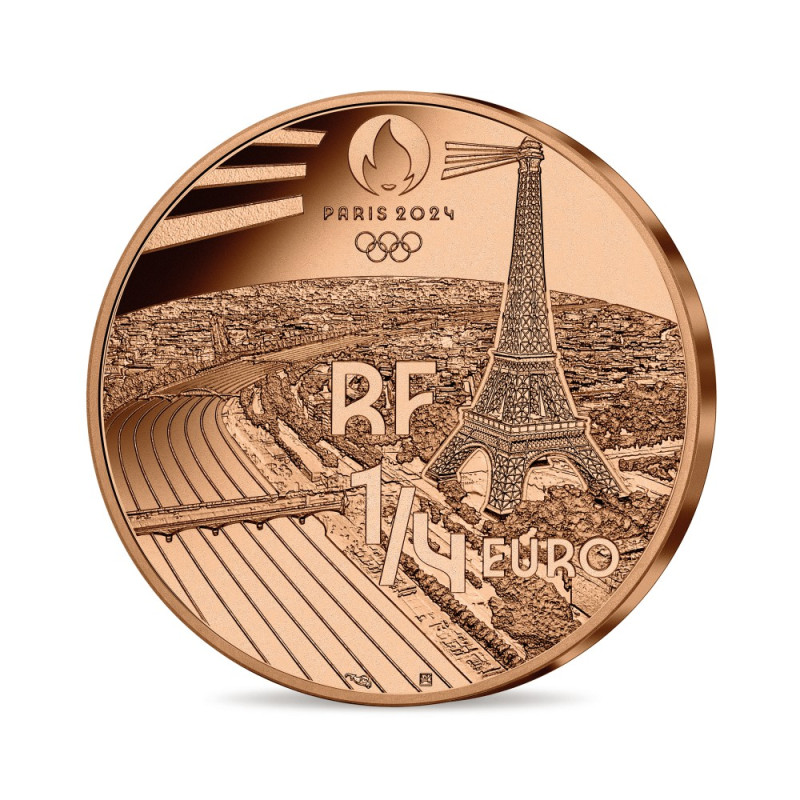 - En arrière-plan, une piste d'athlétisme s’étend, rappelant le sport. Le revers, commun à la série depuis 2021, présente une vue de Paris ou la Seine prend des allures de piste d'athlétisme. La tour Eiffel domine la ville et illumine la compétition.