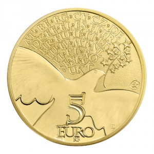 Le revers représente une colombe portant un rameau d'olivier dont les branches ont été remplacées par les 12 étoiles du drapeau Européen, symbole de la paix en Europe.