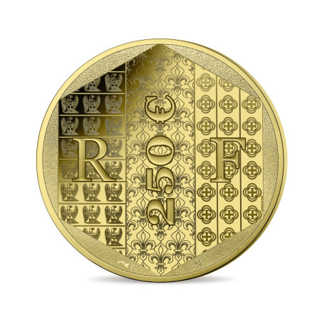 - Réinterprétation de l’historique Louis d’or, cette monnaie exceptionnelle reprend les traits de la coupure en or créée sous Louis XIII pour concurrencer les coupures espagnoles en or déjà en circulation. Gravé par Jean Warin, le profil du roi Louis XIII provient d’une monnaie de 10 Louis actuellement conservée dans les collections de la Monnaie de Paris. On retrouve à gauche du portrait les monogrammes de Louis XIII. La lettre A correspond à l’atelier dans lequel a été frappée la monnaie originale ayant servi d’inspiration pour cette création (A=Paris).