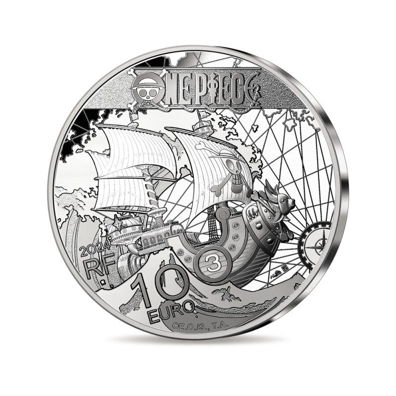 - À l’occasion du 25ème anniversaire de la diffusion du premier épisode de l’animé au Japon, la Monnaie de Paris frappe en exclusivité les premières monnaies de collection One Piece. Produites au cœur de Paris, cette monnaie présente sur sa face Luffy et son iconique chapeau de paille, ainsi que le Skull du drapeau de son équipage. Au revers, on retrouve le Thousand Sunny, navire de l’équipage de Chapeau de paille, bravant Grand Line pour les aider dans leur recherche du One Piece. Le fond de la monnaie présente une trame de cartographie marine. Le millésime, le sigle RF et la valeur faciale de la monnaie sont également inscrits sur cette face.