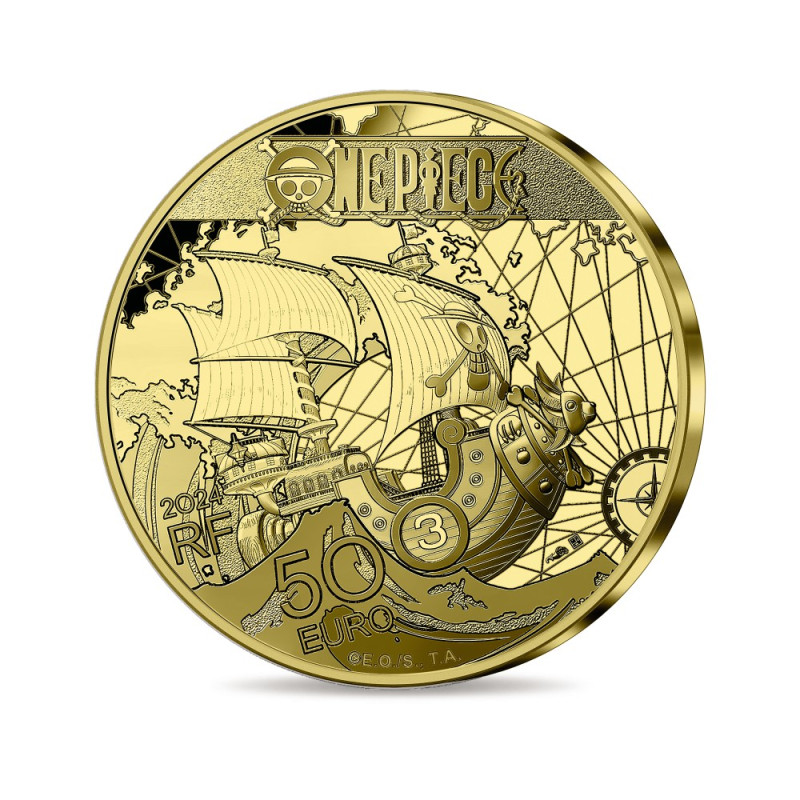 - À l’occasion du 25ème anniversaire de la diffusion du premier épisode de l’animé au Japon, la Monnaie de Paris frappe en exclusivité les premières monnaies de collection One Piece. Produites au cœur de Paris, cette monnaie présente sur sa face Luffy et son iconique chapeau de paille, ainsi que le Skull du drapeau de son équipage. Au revers, on retrouve le Thousand Sunny, navire de l’équipage de Chapeau de paille, bravant Grand Line pour les aider dans leur recherche du One Piece. Le fond de la monnaie présente une trame de cartographie marine. Le millésime, le sigle RF et la valeur faciale de la monnaie sont également inscrits sur cette face.