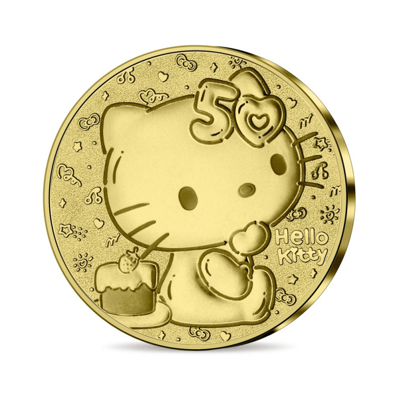 - Sur la face de la monnaie figure une Hello Kitty avec un nœud spécialement créé pour son 50ème anniversaire. Son gâteau d’anniversaire figure au premier plan.