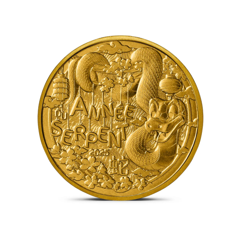 Entouré de fleurs de prunier, symbole emblématique de l’histoire et de l’art chinois, ainsi que de lanternes, le serpent est représenté de manière joyeuse et enfantine. L’inscription « Année du Serpent », suivie du millésime 2025, est positionnée au centre de la monnaie. L’idéogramme du serpent apparaît subtilement en-dessous.