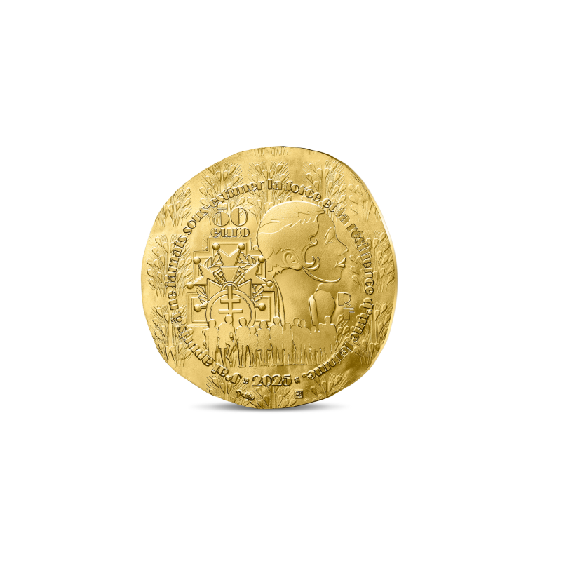 Le revers représente d’autre partie de sa vie. Son passé de mère adoptive et humaniste avec la représentation de la célèbre Tribu Arc-en-ciel, celui de résistante et d’héroïne avec plusieurs décorations : la médaille de la Croix de guerre, la médaille de la Légion d’Honneur et la Croix de Lorraine de la médaille commémorative des services volontaires dans la France Libre.