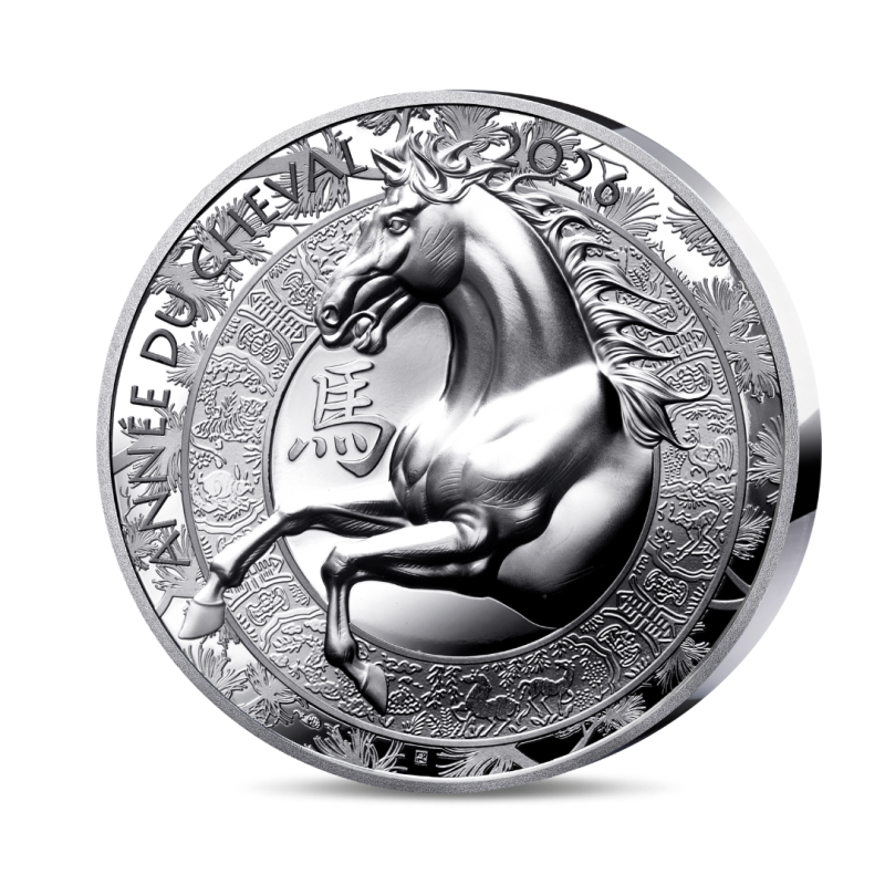 Avers : un cheval galopant traverse un anneau orné de motifs traditionnels chinois.