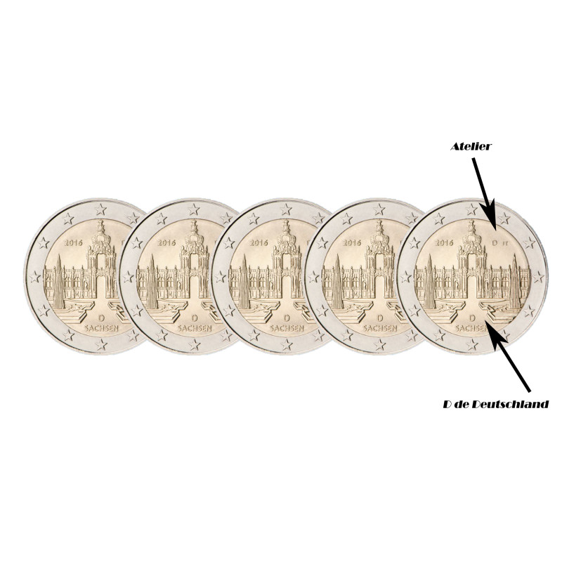L’Allemagne possède différents ateliers de frappe. Chaque atelier se distingue par une lettre spécifique gravée sur l’avers de la pièce. En règle générale, les collectionneurs possèdent chaque pièce allemande frappée par les cinq ateliers de frappe.