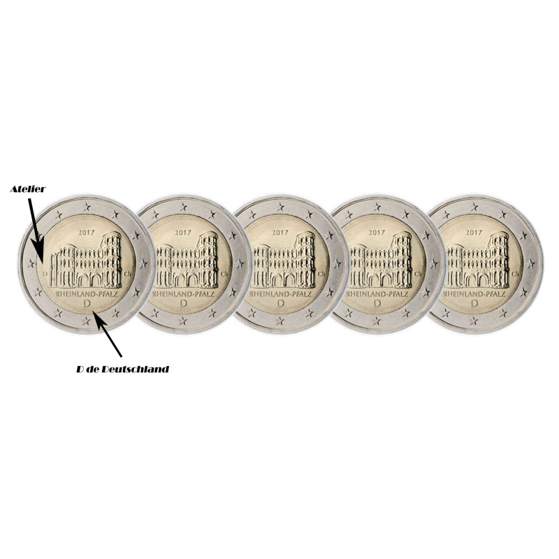 L’Allemagne possède différents ateliers de frappe. Chaque atelier se distingue par une lettre spécifique gravée sur l’avers de la pièce. En règle générale, les collectionneurs possèdent chaque pièce allemande frappée par les cinq ateliers de frappe.