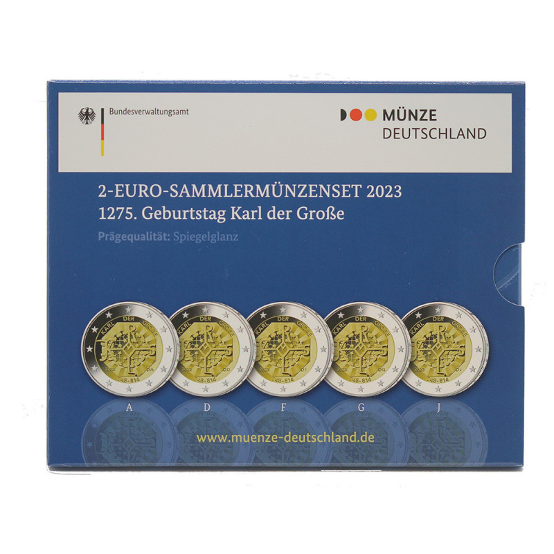 - Avers : Sur le cœur, un dessin de l’artiste graveur Tobias Winnen commémorant les mille-deux-cent-soixante-quinze ans de la naissance de Charlemagne, représentant le sceau de l’empereur et roi des Francs ; dans la partie supérieure, la légende KARL DER GROßE ; dans la partie basse, la lettre majuscule D de Deutschland (Allemagne), la lettre d’atelier, le millésime 2023 et les années de naissance et de mort de Charlemagne, 748 et 814 ; sur la couronne, les douze emblématiques étoiles européennes à cinq branches pointe vers le haut