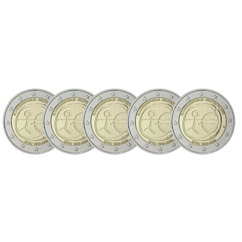 Ces 5 pièces de 2 euros commémoratives ont été émises en commun avec 16 pays de l'euro afin de célébrer les 10 ans de l'Union Economique et monétaire.