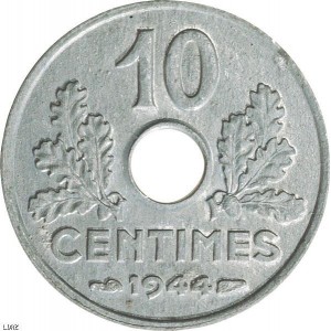 Avers : quatre épis de blé maintenus par une bague sont représentés en-dessous d'un trou central