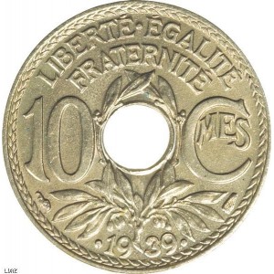 Revers : un trou central est entouré d'une branche d'olivier en deux rameaux et encadré par la valeur faciale.