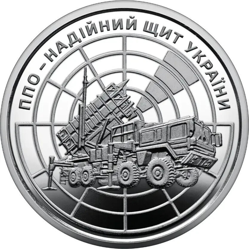 Revers : il y a une image d'un lanceur Patriot et une image stylisée d'un radar détectant une cible ; ci-dessus se trouve la légende circulaire suivante : ППО – НАДІЙНИЙ ЩИТ УКРАЇНИ (Défense aérienne – Le bouclier fiable de l'Ukraine).